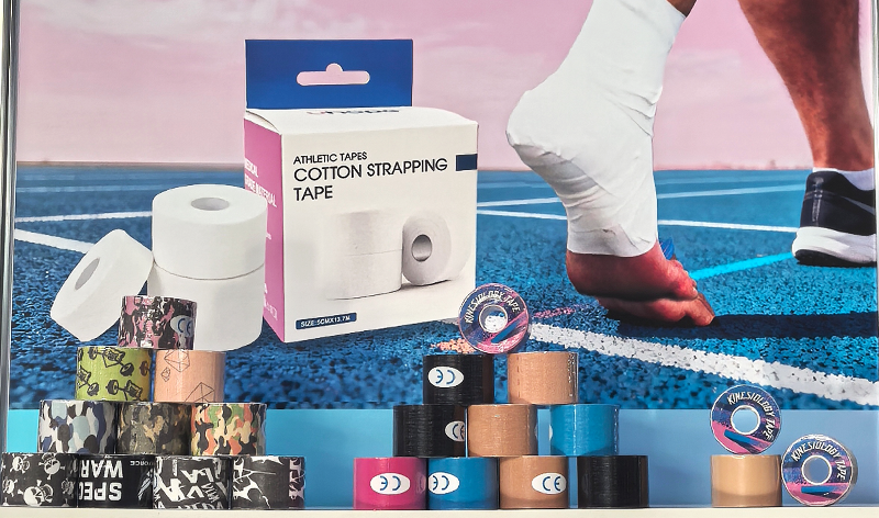 Fita Cinesiológica e Fita Atlética: Fita muscular hipoalergênica com 30% de elasticidade (resistência ao desgaste por 7 dias) e fita esportiva rasgável e resistente à água (ideal para estabilização de articulações) — disponível em 8 cores vivas e estéreis.